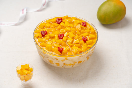 Fluffy vanilla sponge layered with rich vanilla crème brûlée, freshmango slices, and smooth mango purée....
